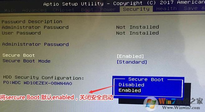1、重启笔记本按delete进入BIOS设置,在Security下把Secure Boot Control设置为Disabled,关闭"安全启动",然后按F4保存更改重启,如截图: