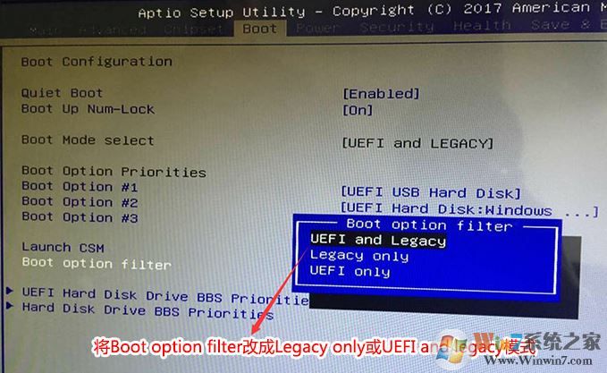 2、重启后再按delete,进入选择Boot选项,将Boot option filer回车设置成legacy only或uefi and legacy,如下图所示;