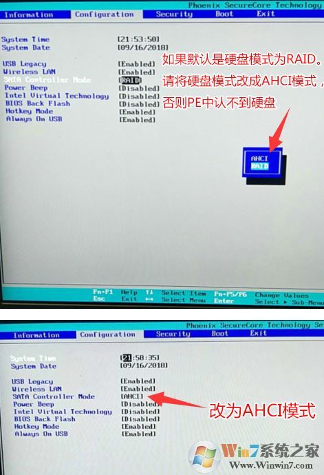 6、注意:再返回configuration这项,查看sata controller mode这项,如果默认硬盘模式为RAID,请将硬盘模式改为AHCI模式,否则进PE后不能认出硬盘,如果更改后记得按F10保存,如下图所示;