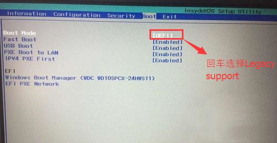 4、切换到Boot,把Boot Mode从UEFI改成Legacy Support;