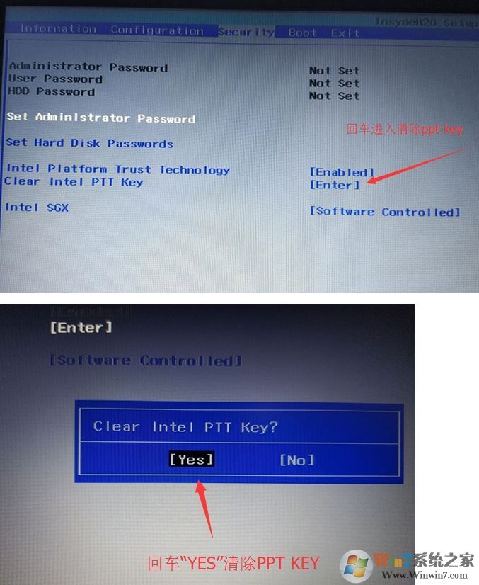 注:按如果Security选项下没有Secure Boot选项,看下是否有"clear intel PTT Key"选项,如果有进入回车选选择“yes”清除ppt key,否则无法安装系统后无法引导启动,如下图所示;