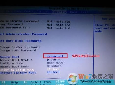 1、开机一直按F2或(FN+F2)进入BIOS,按→方向键切换到Security,选择Secure Boot回车设置成Disabled,如下图所示;