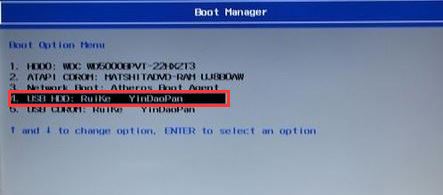 5、插入U盘启动盘,重启时不停的按下f12,打开Boot Manager,选择USB HDD回车从U盘启动,如截图: