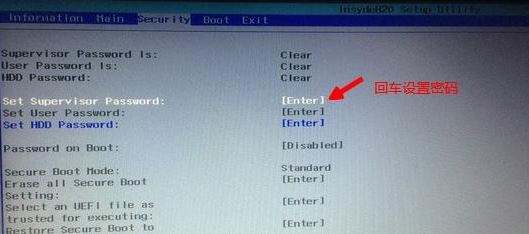 2、如果Secure Boot灰色无法设置,则转到Security,选择Set Supervisor Password回车设置密码,再返回BOOT选项,将Secure BOOT默认enabled为disabled,(注:改完secure boot后再设置密码为空即可,要不每次进BIOS都要设置)如下图所示;