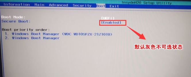 1、开机一直按F2进入BIOS,按F2进入BIOS界面,选择BOOT项后发现secure boot灰色不可选状态,如下图所示;