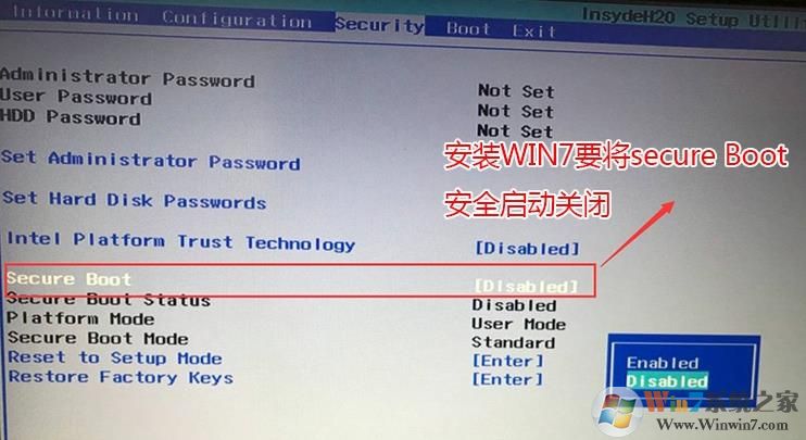2、按→方向键切换到Security,选择Secure Boot回车设置成Disabled,关闭安全启动,这里一定要记得关闭,如下图所示;