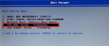 5、插入U盘启动盘,重启时不停的按下f12,打开Boot Manager,选择USB HDD回车从U盘启动,如截图: