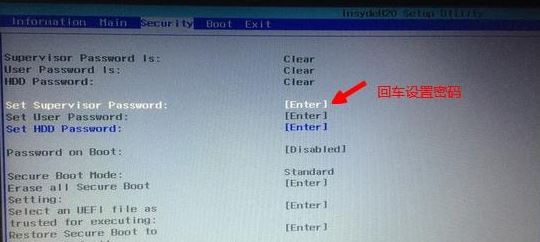 2、如果Secure Boot灰色无法设置,则转到Security,选择Set Supervisor Password回车设置密码,再返回BOOT选项,将Secure BOOT默认enabled为disabled,(注:改完secure boot后再设置密码为空即可,要不每次进BIOS都要设置)如下图所示;