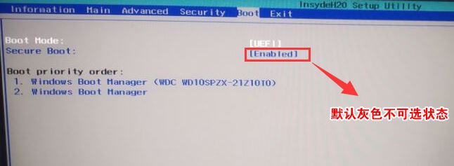 1、开机一直按F2进入BIOS,按F2进入BIOS界面,选择BOOT项后发现secure boot灰色不可选状态,如下图所示;