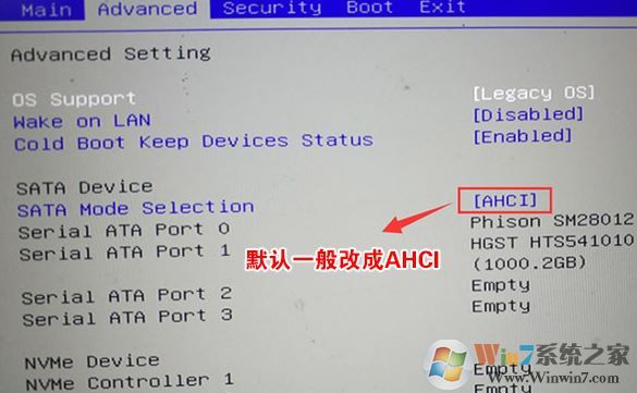 4、再将移动上下方向键,移动到Advanced中将SATA Mode Selection选项的启动项更改为AHCI,否则安装WIN7会出现0x00007b蓝屏,然后再F4保存设置,见截图: