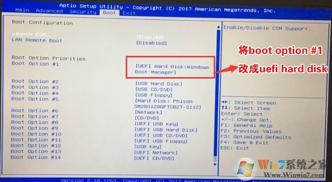 3、再将移动上下方向键,移动将Boot Option #1选项的启动项更改为UEFI Hard Disk:Windows Boot Manager,如下图所示,然后再F4保存设置,如图: