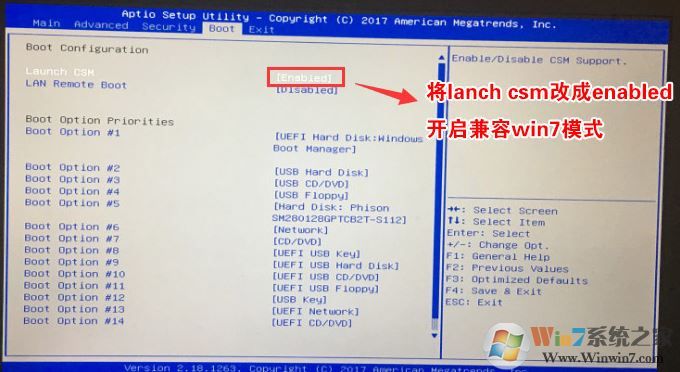2、再将移动左右方向键,移动到BOOT选项卡下,将Launch CMS更改为Enable,开启兼容模式,如图所示: