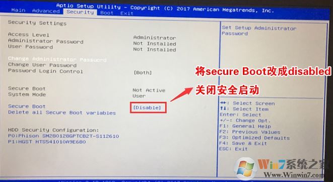 1、重启笔记本一直按f2进入BIOS设置,在Security下把Secure Boot设置为Disabled,关闭"安全启动"如图所示: