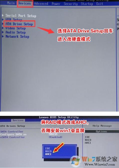 4、切将键盘移动Devices选项,把键盘移动ATA Drive Setup回车,将configure SATA as中默认的raid改成ahci模式,否则安装win7时会出现0x0000007b蓝屏,因为win7中没有集成raid硬盘驱动,然后选择F10保存设置,在弹出的选项中选择YES,如下图所示;