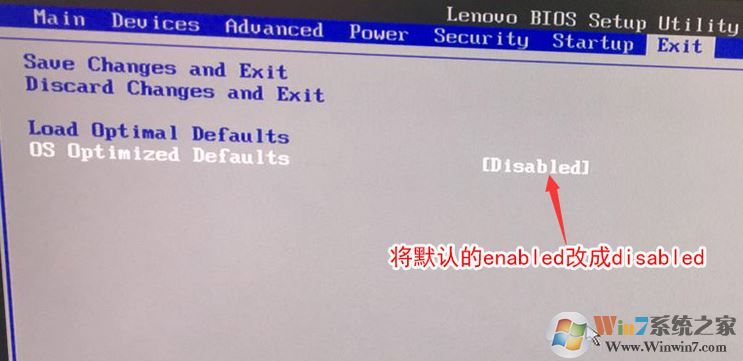 2、转到Exit,把OS Optimized Defaults设置为Disabled;