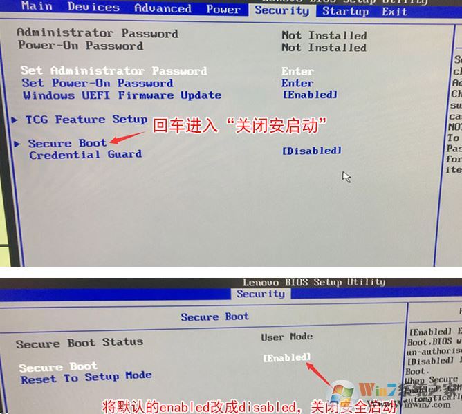 1、开机一直按F2或(FN+F2)进入BIOS,按→方向键切换到Security,选择Secure Boot回车设置成Disabled;