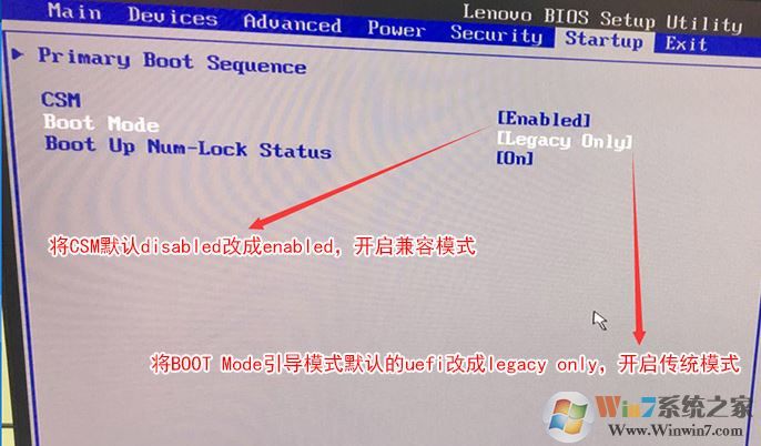 3、切换到Boot,把Boot Mode从UEFI改成Legacy only引导模式,再把csm默认disabled改成enabled,开启兼容模式,选择F10保存设置,在弹出的选项中选择YES;