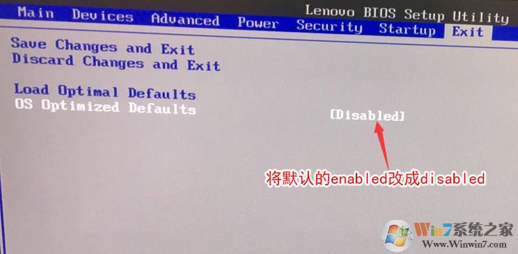2、转到Exit,把OS Optimized Defaults设置为Disabled,如图所示: