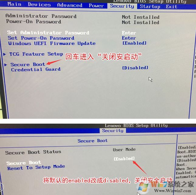 1、开机一直按F2或(FN+F2)进入BIOS,按→方向键切换到Security,选择Secure Boot回车设置成Disabled;