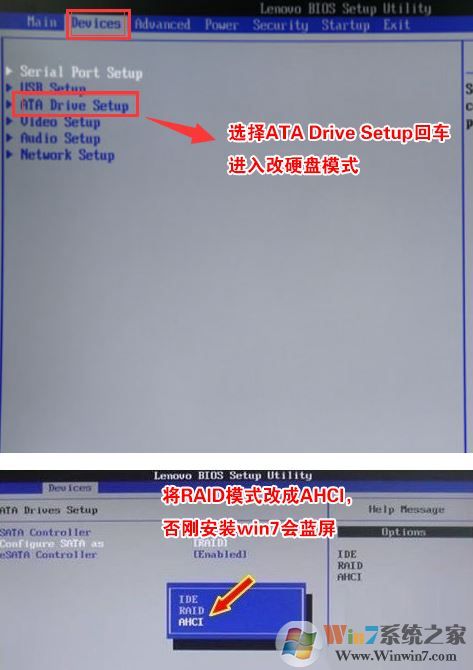 4、切将键盘移动Devices选项,把键盘移动ATA Drive Setup回车,将configure SATA as中默认的raid改成ahci模式,否则安装win7时会出现0x0000007b蓝屏,因为win7中没有集成raid硬盘驱动,然后选择F10保存设置,在弹出的选项中选择YES,如下图所示;