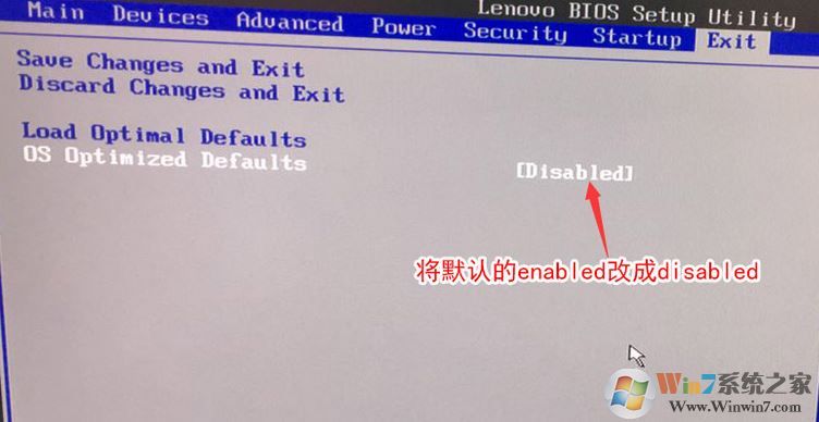 2、转到Exit,把OS Optimized Defaults设置为Disabled,如下图所示;