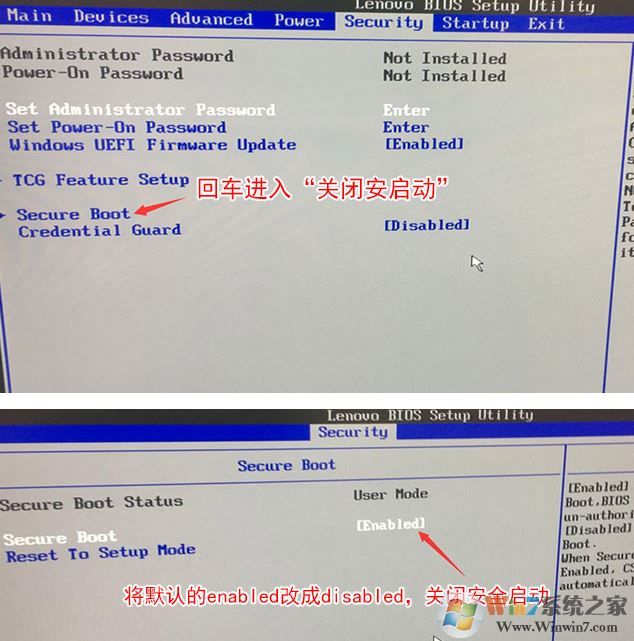 1、开机一直按F2或(FN+F2)进入BIOS,按→方向键切换到Security,选择Secure Boot回车设置成Disabled;