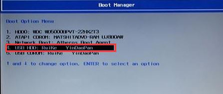 5、插入U盘启动盘,重启时不停的按下f12,打开Boot Manager,选择USB HDD回车从U盘启动,如下图所示;