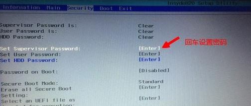 2、如果Secure Boot灰色无法设置,则转到Security,选择Set Supervisor Password回车设置密码,再返回BOOT选项,将Secure BOOT默认enabled为disabled,(注:改完secure boot后再设置密码为空即可,要不每次进BIOS都要设置)如下图所示;