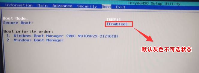 1、开机一直按F2进入BIOS,按F2进入BIOS界面,选择BOOT项后发现secure boot灰色不可选状态,如下图所示;