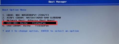 5、插入U盘启动盘,重启时不停的按下f12,打开Boot Manager,选择USB HDD回车从U盘启动,如截图:
