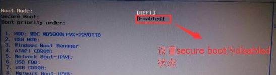 返回BOOT选项,将Secure BOOT默认enabled为disabled,关闭安全启动,如图: