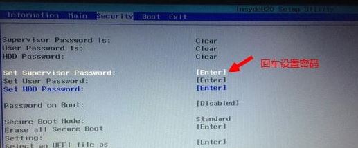 2、如果Secure Boot灰色无法设置,则转到Security,选择Set Supervisor Password回车设置密码,再返回BOOT选项,将Secure BOOT默认enabled为disabled,(注:改完secure boot后再设置密码为空即可,要不每次进BIOS)