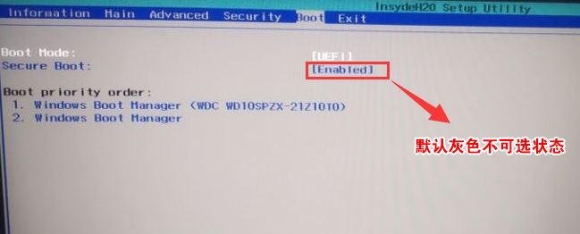 1、方法大同小异,开机一直按F2进入BIOS,按F2进入BIOS界面,选择BOOT项后发现secure boot灰色不可选状态,如下图所示;