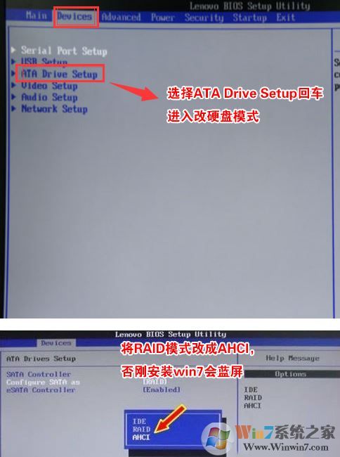 4、切将键盘移动Devices选项,把键盘移动ATA Drive Setup回车,将configure SATA as中默认的raid改成ahci模式,否则安装win7时会出现0x0000007b蓝屏,因为win7中没有集成raid硬盘驱动,然后选择F10保存设置,在弹出的选项中选择YES,如下图所示: