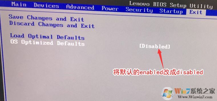 2、转到Exit,把OS Optimized Defaults设置为Disabled,如下图所示;