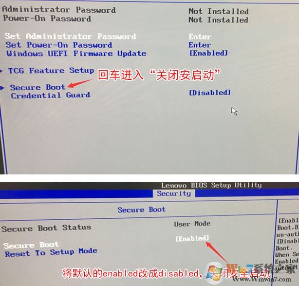 1、开机一直按F2或(FN+F2)进入BIOS,按→方向键切换到Security,选择Secure Boot回车设置成Disabled;