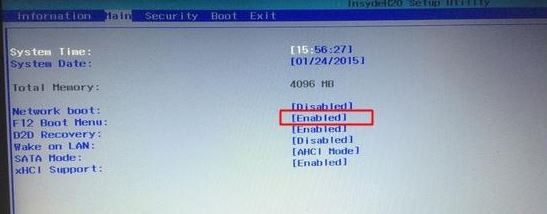 4、转到Main,选择F12 Boot Menu回车,设置为Enabled,按F10选择Yes回车保存修改,如截图: