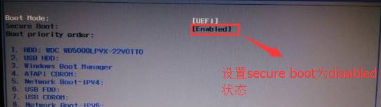 返回BOOT选项,将Secure BOOT默认enabled为disabled,关闭安全启动,如截图: