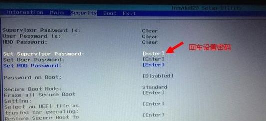 2、如果Secure Boot灰色无法设置,则转到Security,选择Set Supervisor Password回车设置密码,再返回BOOT选项,将Secure BOOT默认enabled为disabled,(注:改完secure boot后再设置密码为空即可,要不每次进BIOS都要设置)如截图:
