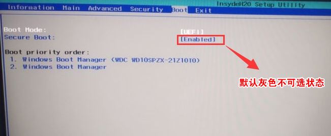 1、开机一直按F2进入BIOS,按F2进入BIOS界面,选择BOOT项后发现secure boot灰色不可选状态,如截图: