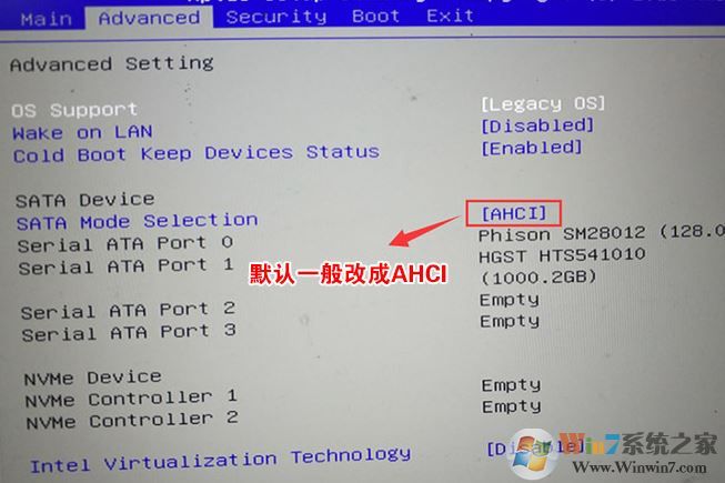 4、再将移动上下方向键,移动到Advanced中将SATA Mode Selection选项的启动项更改为AHCI,否则安装WIN7会出现0x00007b蓝屏,如下图所示,然后再F4保存设置,如图: