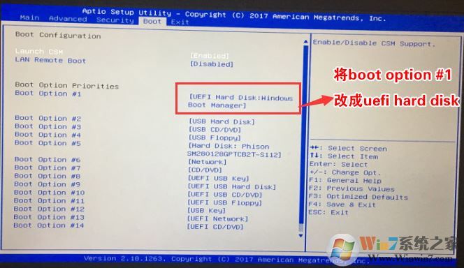 3、再将移动上下方向键,移动将Boot Option #1选项的启动项更改为UEFI Hard Disk:Windows Boot Manager,如下图所示,然后再F4保存设置,如图: