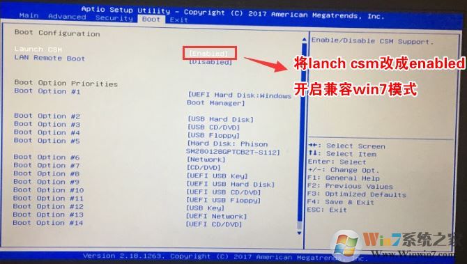 2、再将移动左右方向键,移动到BOOT选项卡下,将Launch CMS更改为Enable,开启兼容模式,如图: