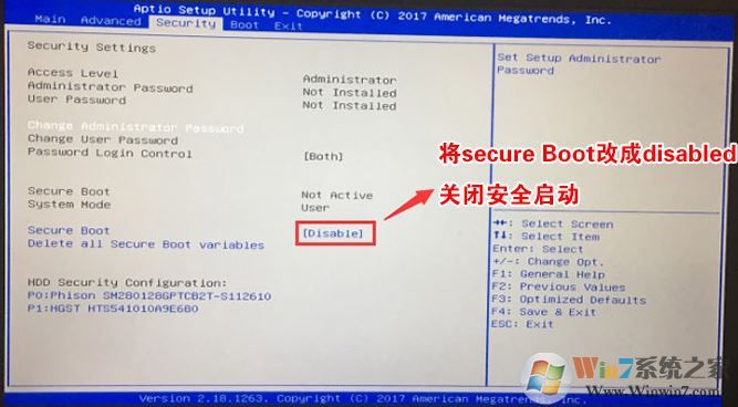 1、重启笔记本一直按f2进入BIOS设置,在Security下把Secure Boot设置为Disabled,关闭"安全启动"如图所示:
