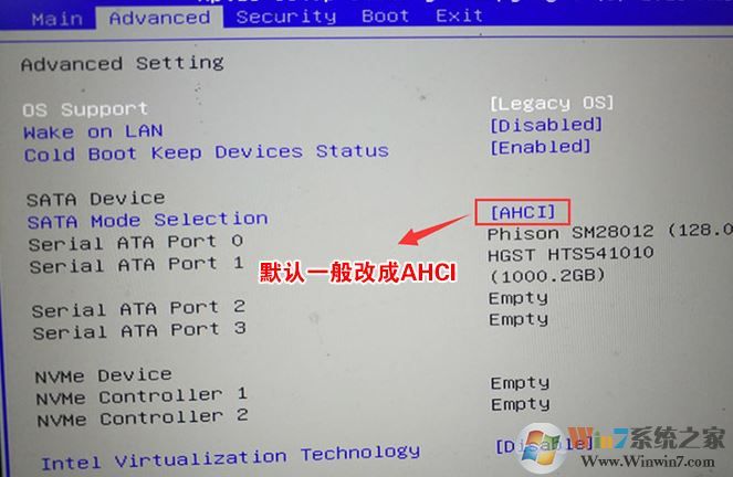 4、再将移动上下方向键,移动到Advanced中将SATA Mode Selection选项的启动项更改为AHCI,否则安装WIN7会出现0x00007b蓝屏,如下图所示,然后再F4保存设置;