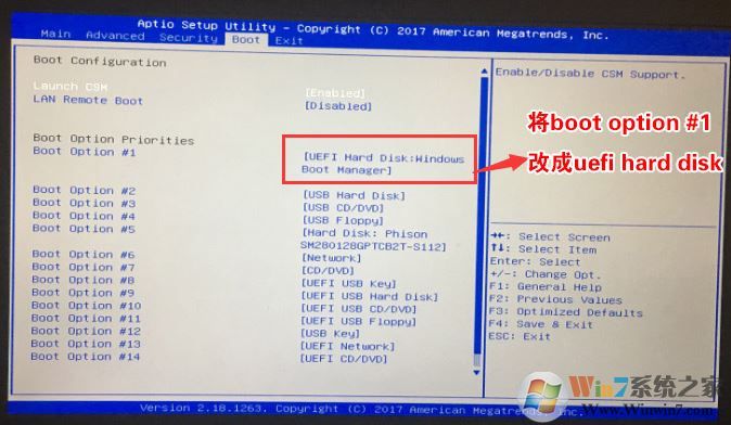 3、再将移动上下方向键,移动将Boot Option #1选项的启动项更改为UEFI Hard Disk:Windows Boot Manager,如下图所示,然后再F4保存设置;