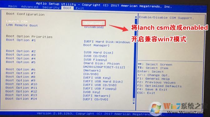 2、再将移动左右方向键,移动到BOOT选项卡下,将Launch CMS更改为Enable,开启兼容模式,如下图所示;