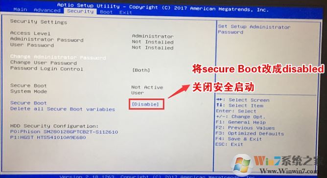 1、重启笔记本一直按f2进入BIOS设置,在Security下把Secure Boot设置为Disabled,关闭"安全启动"如下图所示;