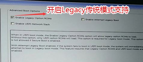 3、切换到Advanced Boot Options将右边的Enable legacy option roms选项打勾,如下图所示;