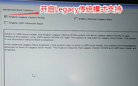 2、切换到Advanced Boot Options将右边的Enable legacy option roms选项打勾,如下图所示;